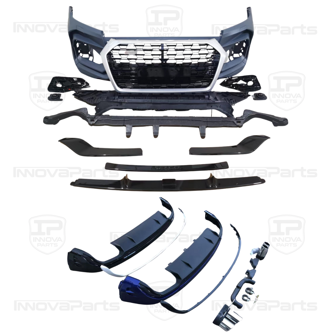 Kit de carrocería compatible con Audi Q5 fabricado entre 2017 y 2020, desarrollado exclusivamente para vehículos con acabado S line. Este conjunto incluye un paragolpes delantero Look RSQ5 y un difusor trasero Look SQ5, diseñados para renovar por completo la estética del vehículo con un montaje sencillo y profesional.